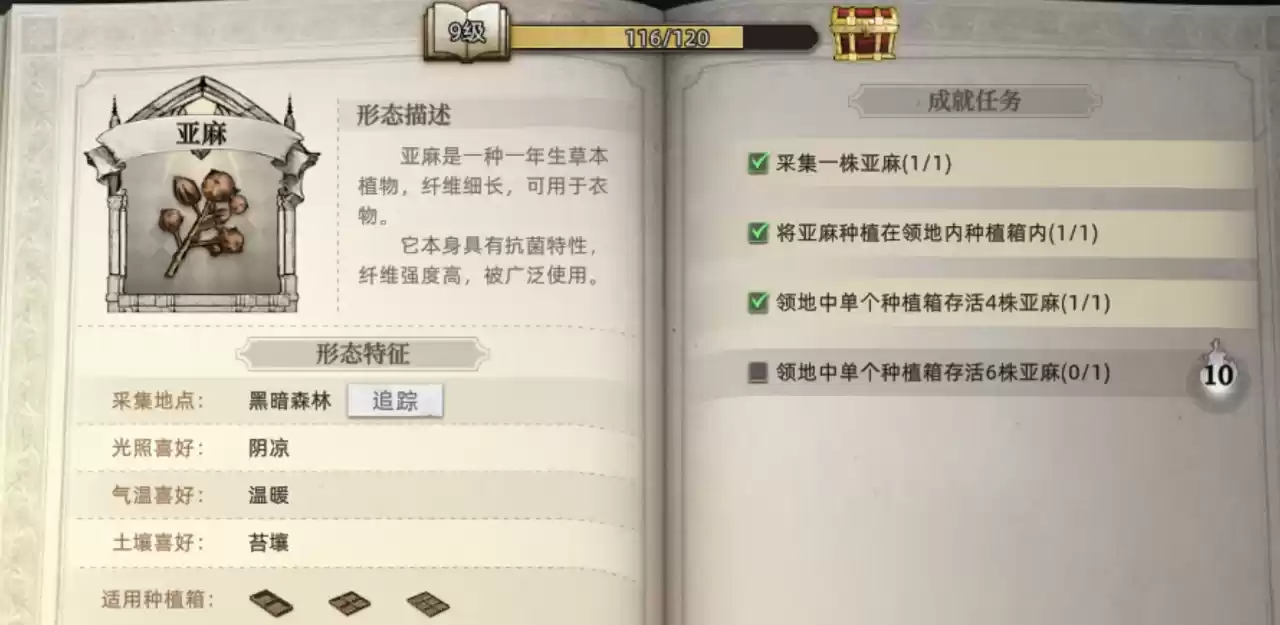 当然,一旦玩家成功种植亚麻之后,就不必再频繁往返于黑暗森林了。只要在家准备好种植箱,就可以直接栽培亚麻,获取方式变得相当便捷。需要注意的是,种植箱中亚麻的产量可能会因环境因素而有所波动,因此种植前,建议大家打开亚麻的图鉴,了解它对光照、气温等条件的要求。合理调整环境,这将大大提高亚麻的存活率和产量。在土壤方面,只需施用1份肥料即可,无论是使用2级还是3级泥土,都能顺利种植。