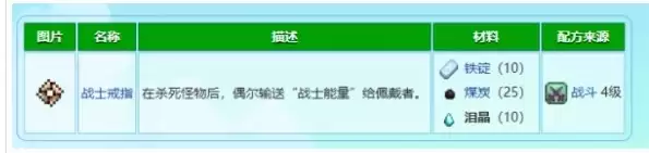 制作战士戒指:消耗10个泪晶、10个铁锭和25个煤炭合成,佩戴后在击杀怪物时偶尔恢复能量。