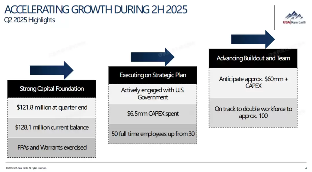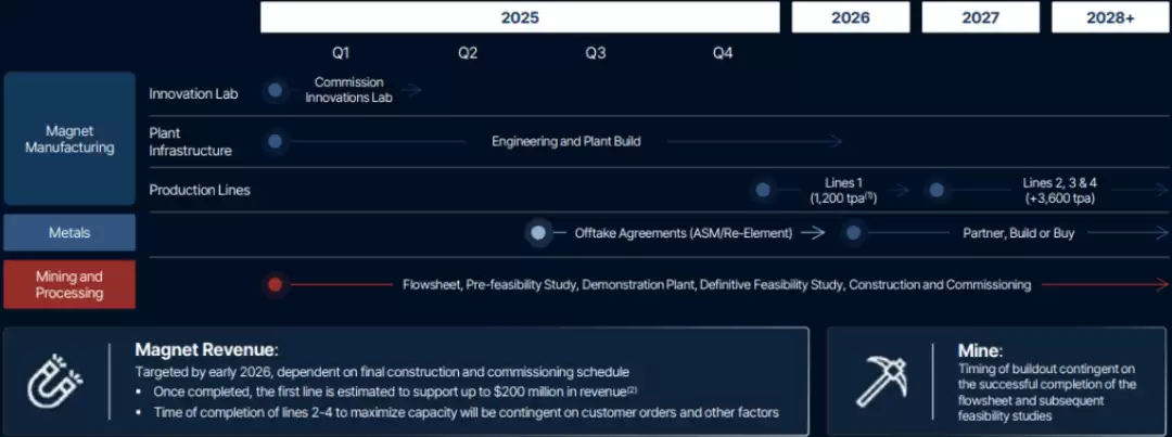 2025年5月,公司成功完成了一笔7500万美元的PIPE融资,这笔资金对于公司的战略执行至关重要,核心作用在于为位于俄克拉荷马州的钕铁硼磁体工厂建设以及得克萨斯州Round Top稀土项目的开发提供资本支持。