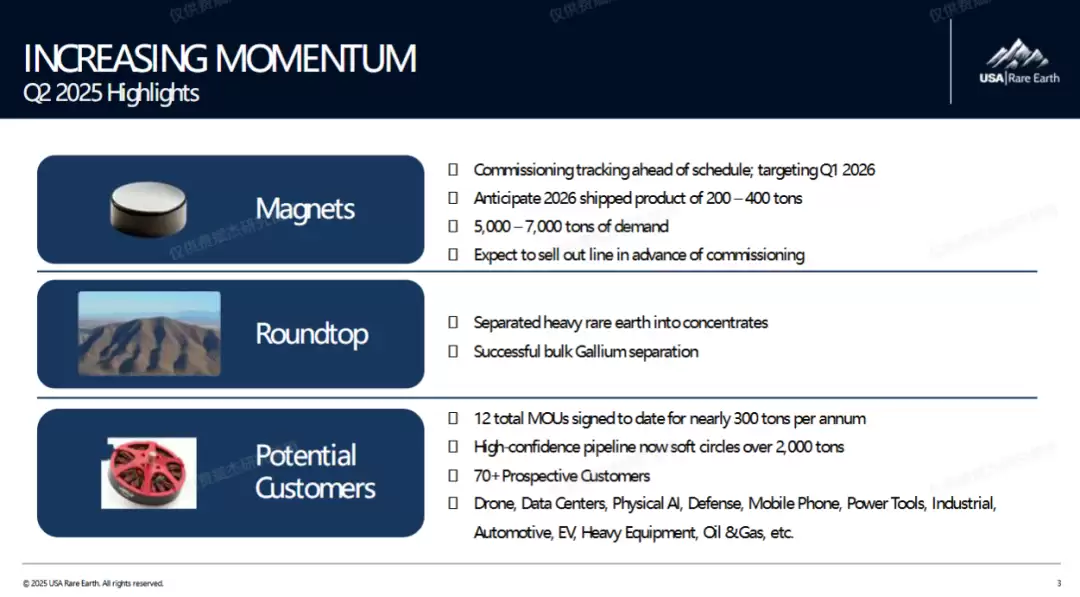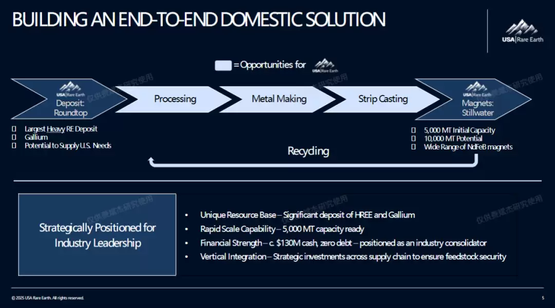公司的长期战略是通过开发Round Top项目实现原材料自给,并结合对美国每年超过5万吨报废磁铁铁的回收利用,最终实现供应链的完全自主化。