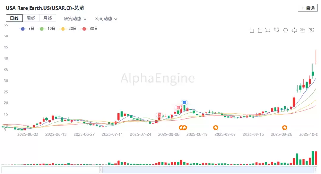 作为美国稀有的“国内重稀土纯粹玩家”,USAR的战略价值在供应链重构的大趋势下尤为凸显,10月初以来的短短两周时间,公司股价上涨100%以上。