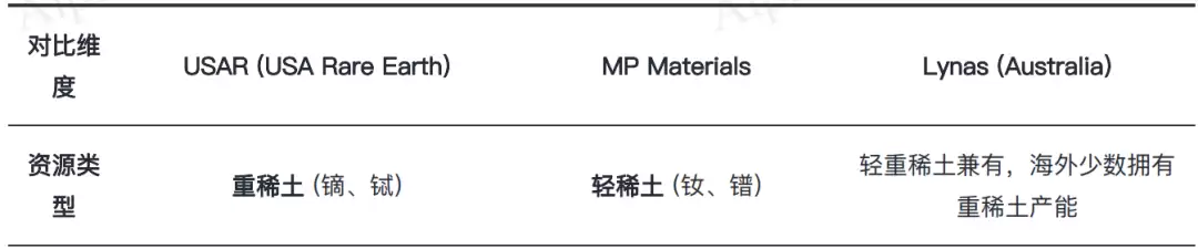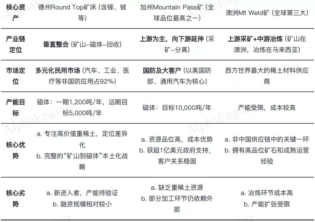 USAR在美国市场与MP Materials形成差异化互补,同时与国际厂商Lynas共同面对中国主导的格局,三者在资源、定位和战略上各有侧重。