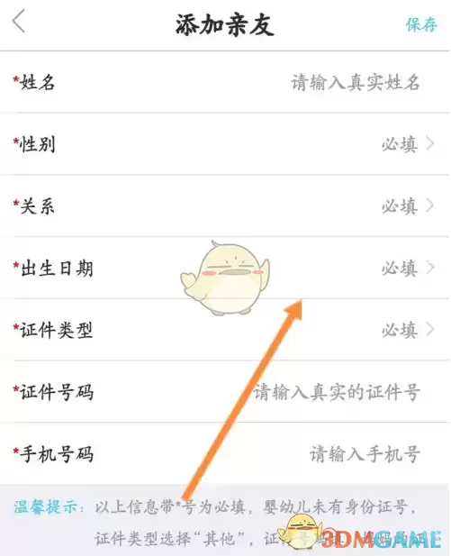 4、最后按要求填写亲友的详细信息,点击保存即可完成添加。