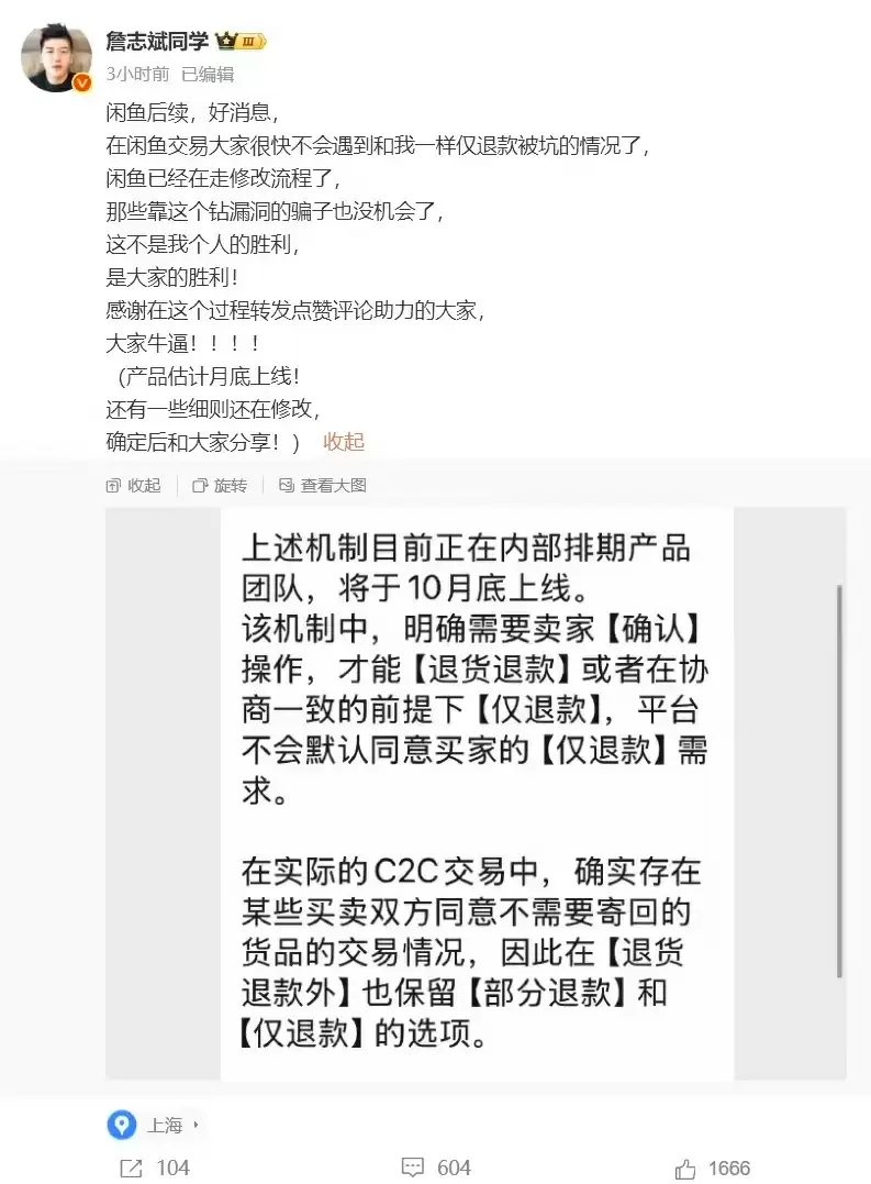 今日,该博主更新了事件后续进展。闲鱼官方对此回应称,平台退款机制将于10月底进行优化升级,新规明确要求卖家必须进行【确认】操作,才能完成退货退款流程;或者在双方协商一致的前提下选择【仅退款】。平台承诺不会再默认通过买家的【仅退款】申请。