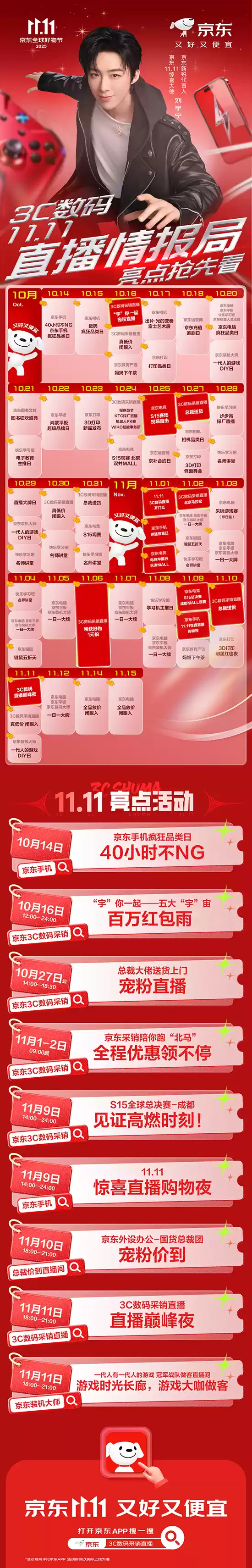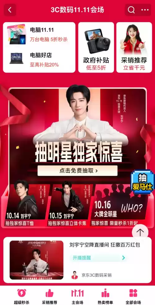 16日当天,用户还可参与助力明星开机屏互动活动,张凌赫、王鹤棣、张小婉、毕雯珺、田曦薇、李现等数十位明星嘉宾共同期待你的参与。上午打开京东APP搜索“3C数码11.11”,首屏点击“明星集卡 万元红包”进入互动页面,点击喜爱明星头像完成任务为其积累人气值,送TA上京东开机屏!中午12点起,3C数码采销直播间将开启12小时不间断直播、百万红包雨持续放送……京东新任代言人刘宇宁将于下午16:00空降直播间,与京东青春采销带来才艺展示,并不定时抽取3C数码大礼包。更有神秘男团出道成团,明星同款好物1元起拍!更多低至1.9折的3C好物,等你来抢购!无论是想观看刘宇宁与机器人的趣味舞蹈,还是获取3D打印专属福利,尽在3C数码采销直播间!