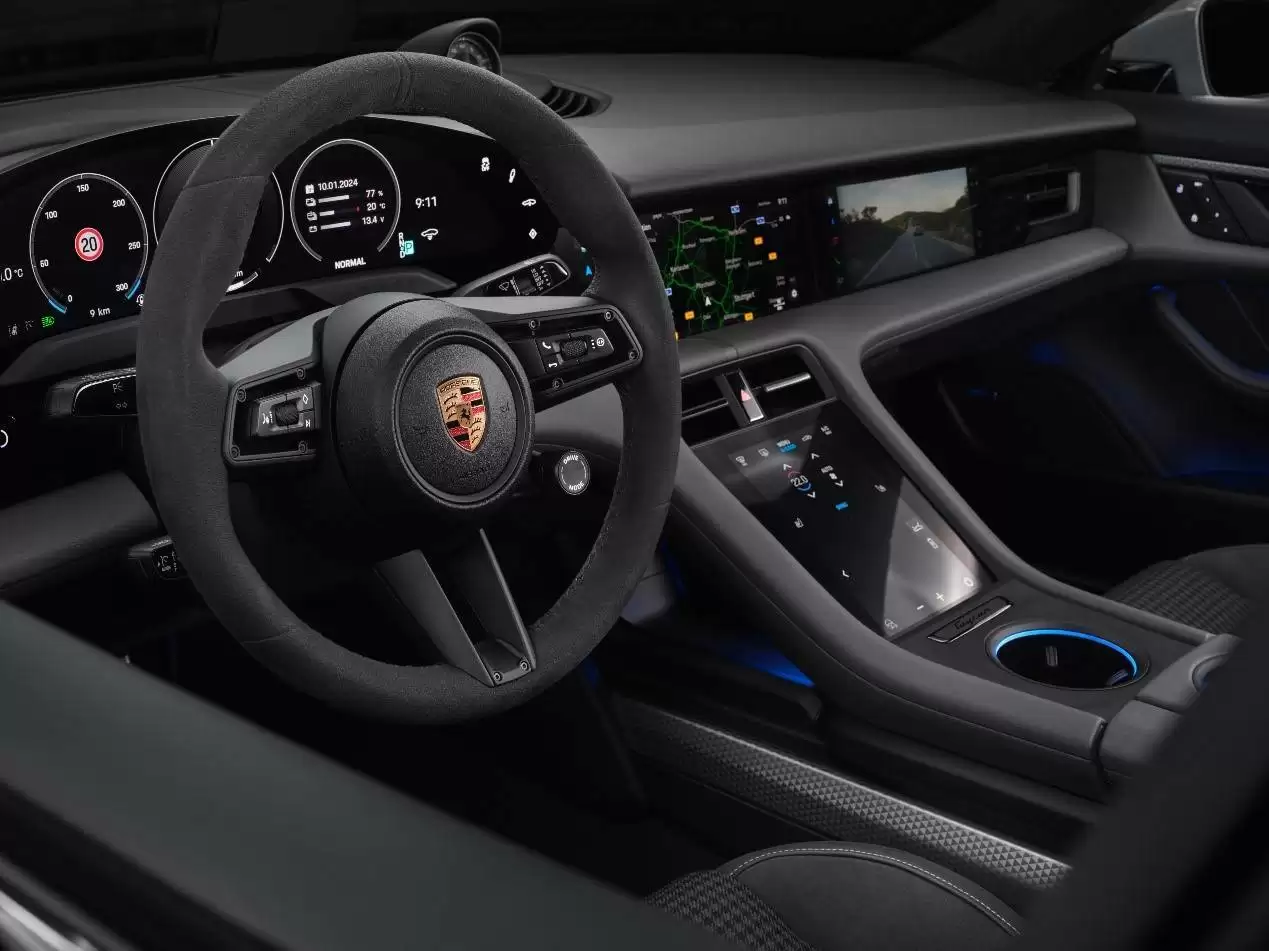 座舱设计延续“以驾驶者为中心”的理念,全液晶仪表、中控主屏与独立空调控制屏构成的三联屏系统成为标配。车内大量采用翻毛皮材质包裹,在运动质感与乘坐舒适性之间取得完美平衡。配置梯度设置清晰合理:入门车型标配真皮加热运动方向盘、14向电动调节记忆座椅、BOSE环绕音响及Sport Chrono组件;高配车型则升级为带模式切换旋钮的多功能方向盘、18向电动调节自适应运动座椅,并配备Burmester高端3D环绕音响与罗盘显示屏。此次改款的最大亮点在于影音系统升级——基础款与GTS车型新增杜比全景声技术,使两大音响系统均可呈现沉浸式声场效果。同时USB快充接口新增电源共享功能,可反向为移动设备供电。
