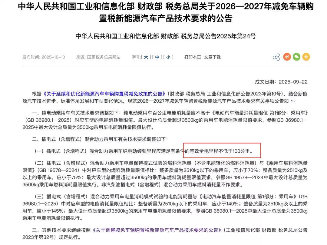 此外,近期有关部门也发文更新了明年新能源购置税减免的政策,首先对产品技术指标提出了新要求,包括能耗、纯电续航里程和低温衰减等维度,部分10万级插混车型可能会受到影响。