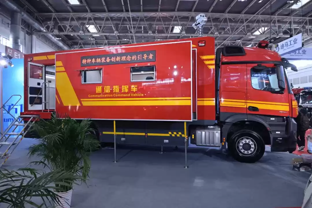在城市主战领域,江苏振翔展出的奔驰Arocs 1836底盘消防车实现了8-10人载员能力,支持4-6吨载液量的定制化分隔。其消防泵与炮流量均达到60-80升/秒,全自动泡沫比例混合器可实现1%-10%的精准调控,集成控制系统覆盖水/泡沫控制、出口恒压、管路监控等功能,配合电动拉梯架可一键操作多种梯具,完美适配城市复杂救援环境。而奔驰通信指挥消防车采用双侧拓展舱结构,展开面积达20平方米,可容纳20人同时作业,搭载卫星通信、无人机侦察、音视频指挥等六大系统,配合5匹恒温空调与18千瓦发电照明装置,构建起移动式消防指挥中枢。
