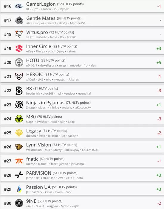 第11至20名区间里,FaZe战队排名上升三位,进步最大的当属HOTU战队——他们在EPL赛事中的表现令人眼前一亮,整体提升了五个位次。TYLOO战队也前进一位,目前位列第15名。