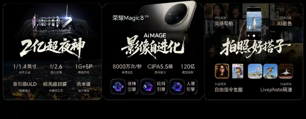 荣耀Magic8 Pro主摄搭载2亿像素超感光夜神长焦,采用超大底传感器与超大光圈镜头组结构,并运用行业领先的萤石级玻璃镜片、航天级封装工艺、纳米级镜片镀膜,确保顶级的光学品质。