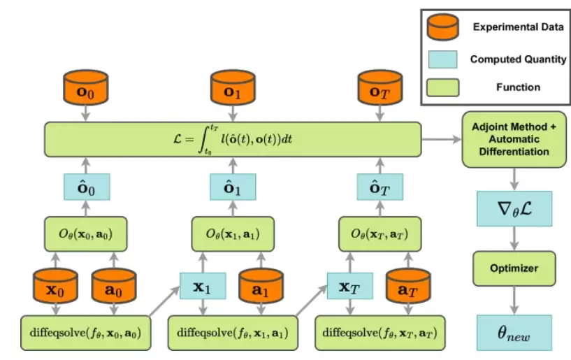 神经状态空间模型(NSSM)的训练过程,遵循高效且自动化的流程。模型由动力学函数fθ和观测函数Oθ定义,进行前向模拟生成预测数据,并与实验观测值对比计算损失。借助diffrax和JAX的自动微分伴随方法,从而优化模型参数。