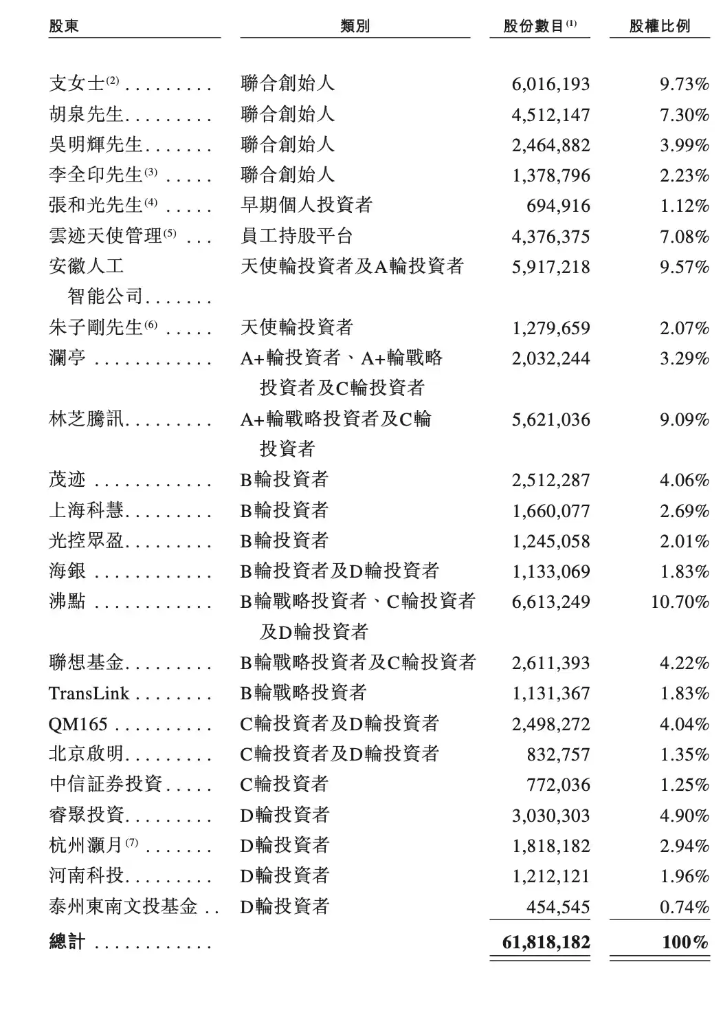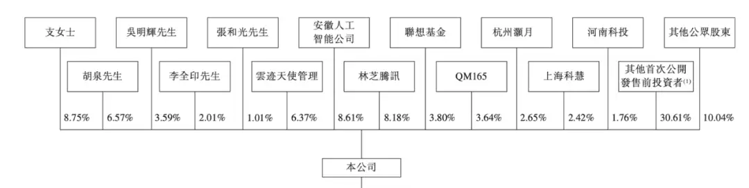 此外,沸点资本合计持股9.62%,系第一大外部股东;科大讯飞系安徽人工智能公司持股8.61%;林芝腾讯持股8.18%;启明创投旗下QM165持股3.64%,北京启明持股1.21%,合计持股约4.85%;联想基金持股3.80%;阿里旗下杭州瀚月持股2.65%;早期个人投资者张和光持股1.01%。