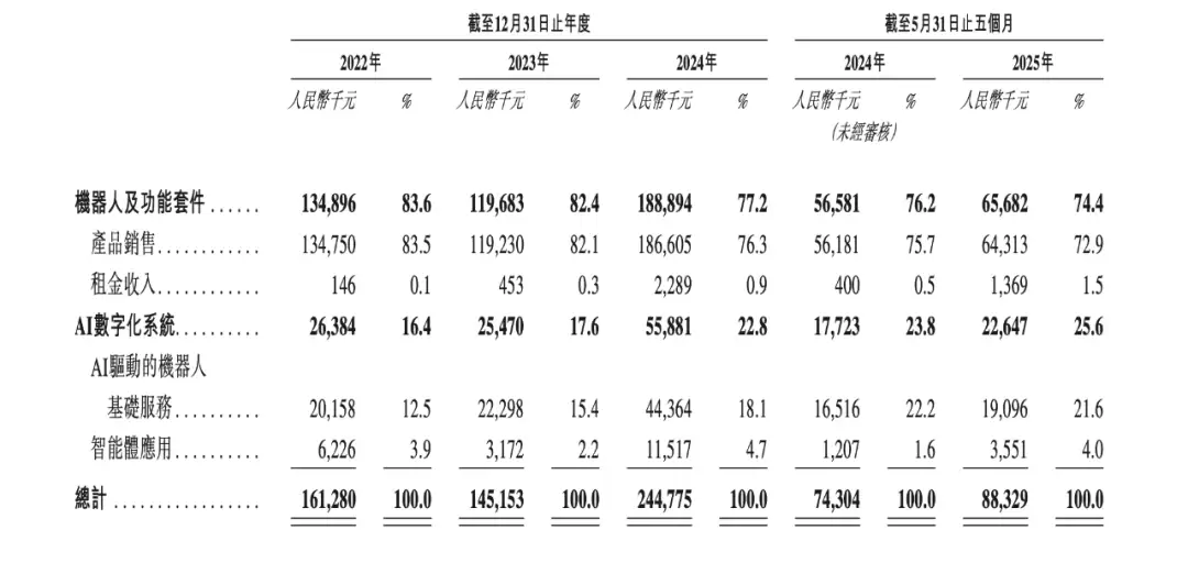招股书显示,云迹科技的产品及服务组合主要销售或租赁机器人及功能套件的交易及租赁付款;在AI数字化系统下提供服务的订阅式、交易及佣金式付款。同时,公司也通过向个人客户销售商品产生收入。