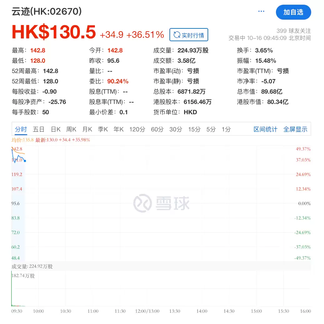 截至发稿,云迹科技上涨36.51%报130.5港元,总市值89.68亿港元,港股市值80.34亿港元。