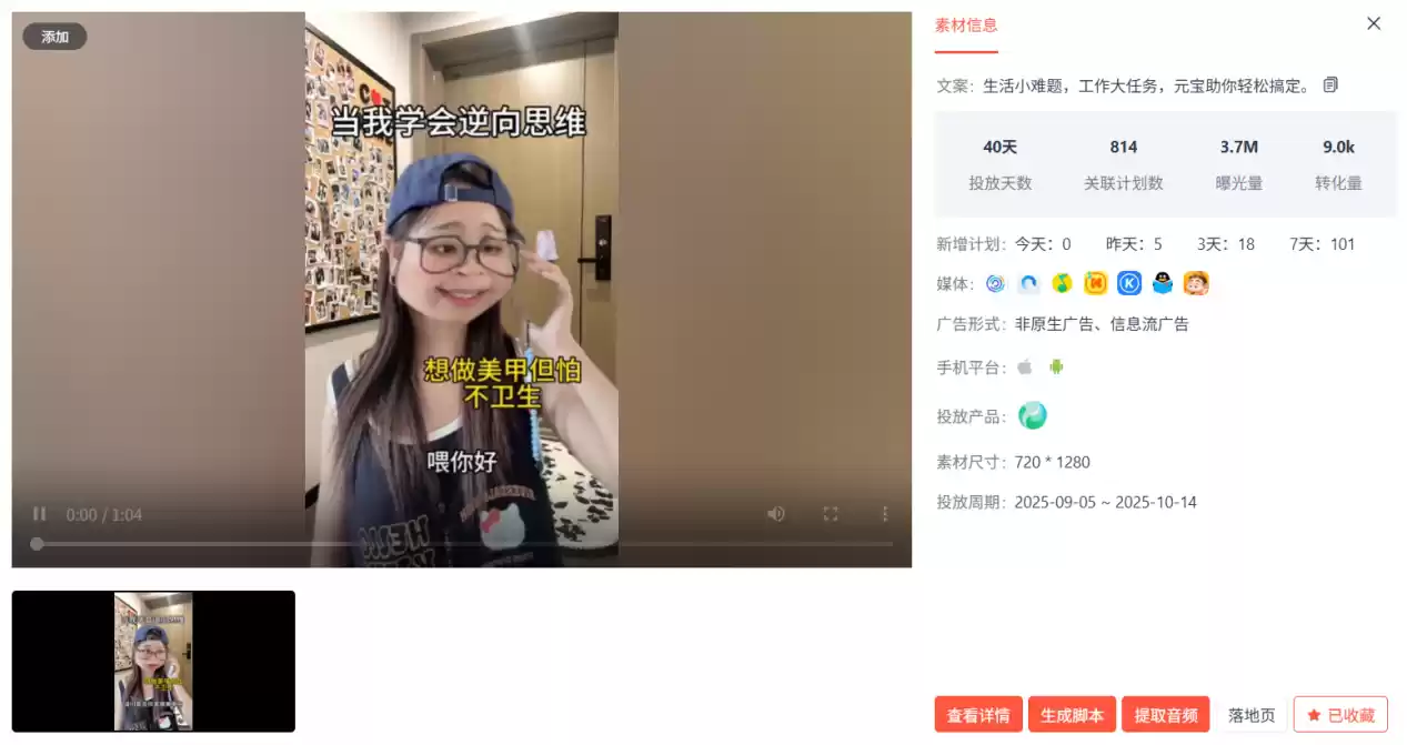 这条来自腾讯元宝的新增高曝光视频素材,累计曝光量达370万次,转化量超过9000次。