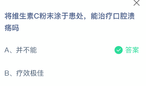 将维生素C粉末涂于患处,能治疗口腔溃疡吗?支付宝小鸡课堂开课啦!每天花一分钟答题赚饲料,喂喂小鸡就能贡献爱心啦!轻松又意义十足!2025年10月16日蚂蚁庄园的小鸡课堂题目正确答案
