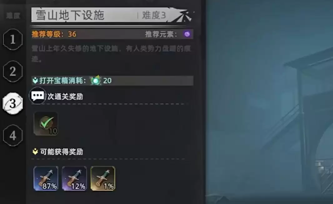 能够掉落冰晶剑的副本是雪山地下设施。在难度3时就有1%概率掉落金色品质的冰晶剑,而且紫色冰晶剑的掉落概率相当高。再加上难度4时金色冰晶剑的掉率仅仅提升了0.5%,因此更建议想要获得冰晶剑的玩家前期只考虑刷难度3,等练度提升上来或自己有更好的装备后,再去挑战难度4。此外,难度3的推荐等级虽然是36级,但技术好的话20多级就能前往挑战,这也让它成为刷取冰晶剑效率最高的副本。另外,由于副本的位置在冰原,会受到寒冷环境影响,所以下副本前最好先给角色吃两个抗寒药。