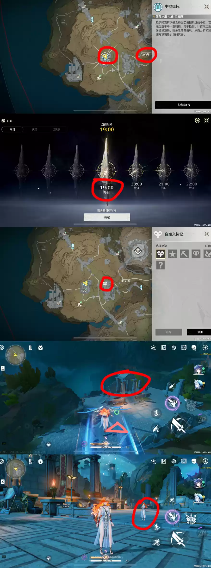 传送至:七丘地图左半部分的巨石原-中桅信标,将时间调整至次日晚上19:00(需前往下图中标记位置)小地图-东偏南一点点