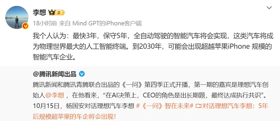 李想:自动驾驶汽车3-5年落地 2030年规模或超iPhone