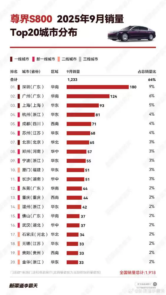 据统计,TOP20城市累计销量达1233辆,占全国总销量的64%。其中华东地区8座城市(主要集中在江浙地区)的销量占比最高,华南次之,华中与西南基本持平,华北则相对较低。这一分布格局反映出尊享S800在不同区域的市场渗透力存在显著差异。