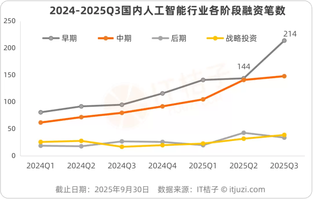 早期投资事件显著增长——从2025年Q2的144笔增至214笔,增幅高达49%;而中后期投资基本停滞不前,甚至有所降低。由于早期投资单轮金额普遍较低,即便事件量激增,也难以拉动总金额大幅增长,因而导致了Q3季度整体融资金额仅微增。
