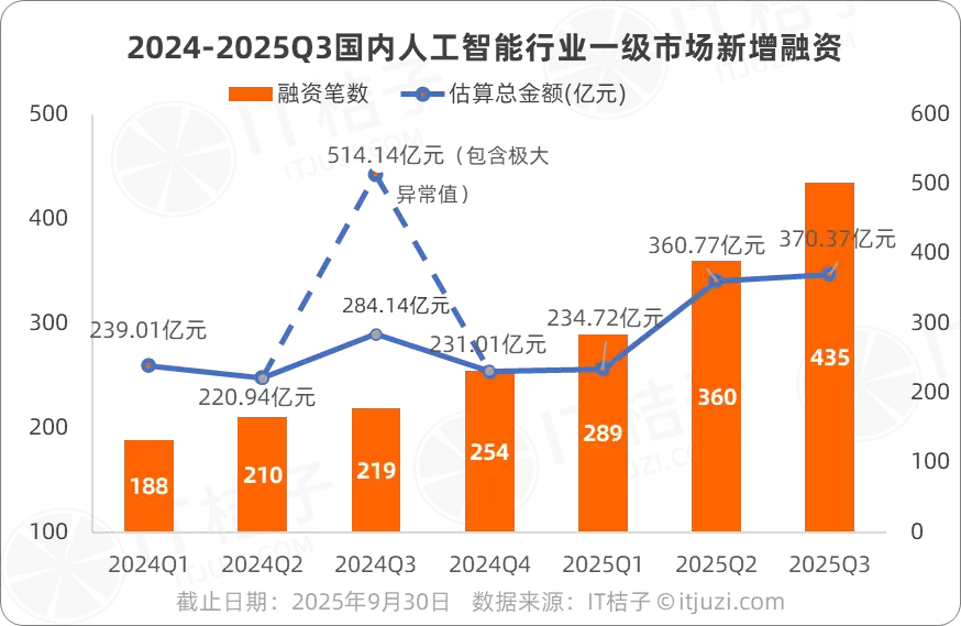 根据IT桔子数据,从2024年Q1至2025年Q3,国内AI行业的新增融资事件数实现了连续大幅跨越,从188笔到2025年Q2基本实现翻番。2025年Q3则达到了435笔,环比增长20.8%,同比增长达99%。