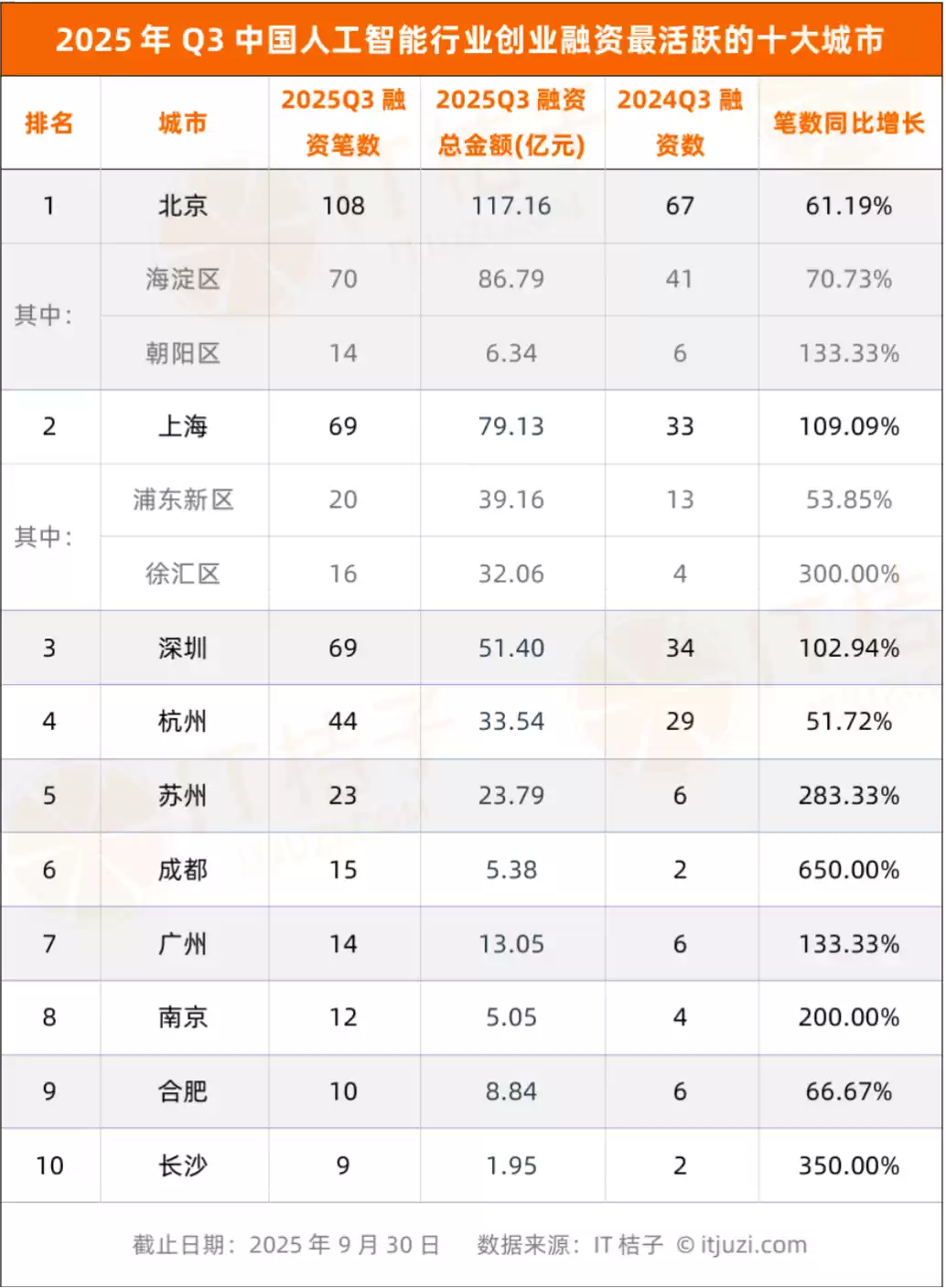 三季度AI融资同比翻倍,长三角领跑,长沙跻身全国前十