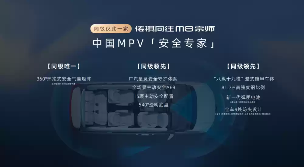 传祺依托自主研发的"星灵安全守护体系",为向往M8宗师版构筑起全方位的主被动安全防线。