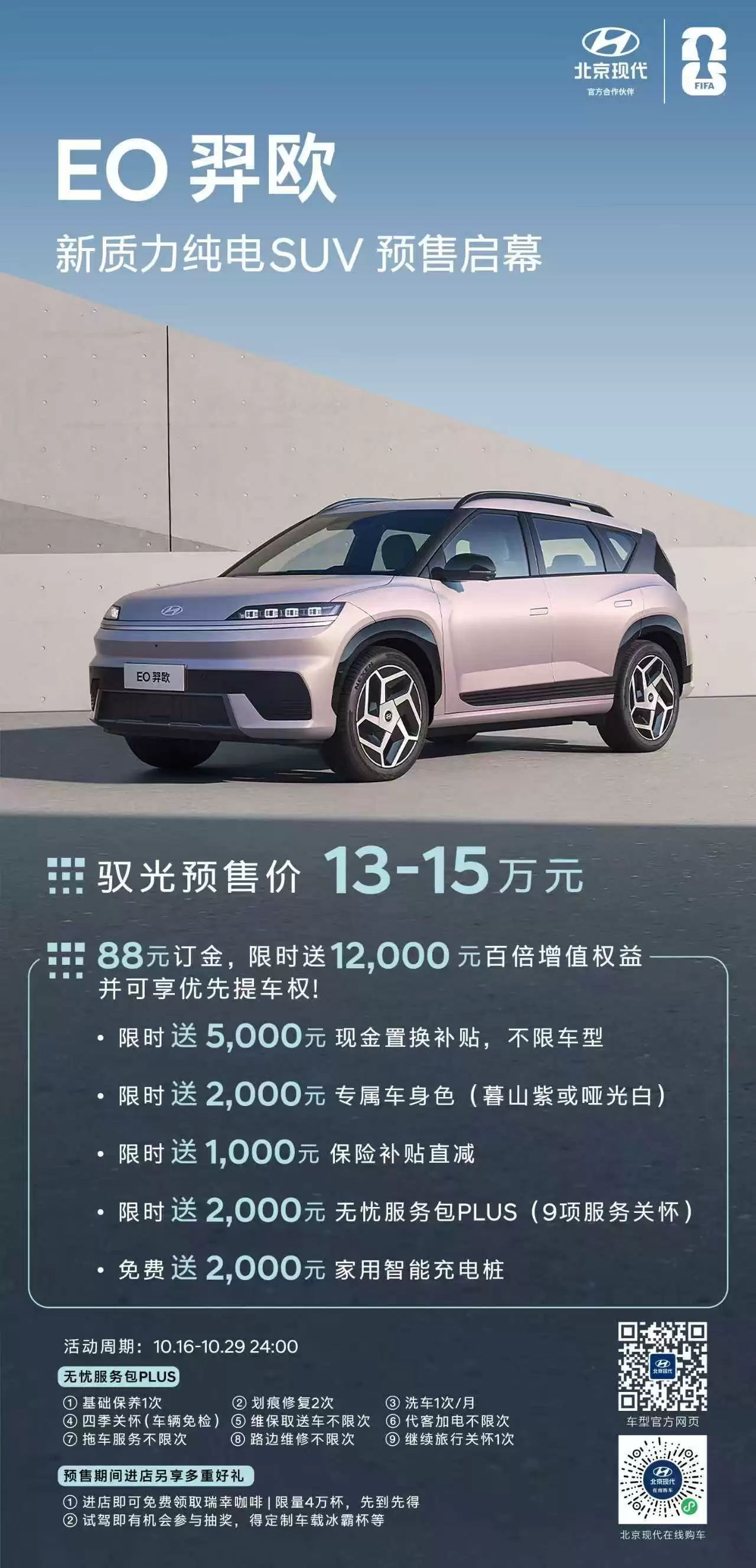 北京现代全新纯电紧凑型SUV——EO逸欧正式开启预售,预售区间为13-15万元,计划于10月29日正式上市。该车型基于E-GMP全球纯电动车专属平台打造,提供FUN、SMART、TECH三种版本,CLTC纯电续航最高可达722公里,成为纯电动SUV市场备受瞩目的新焦点。