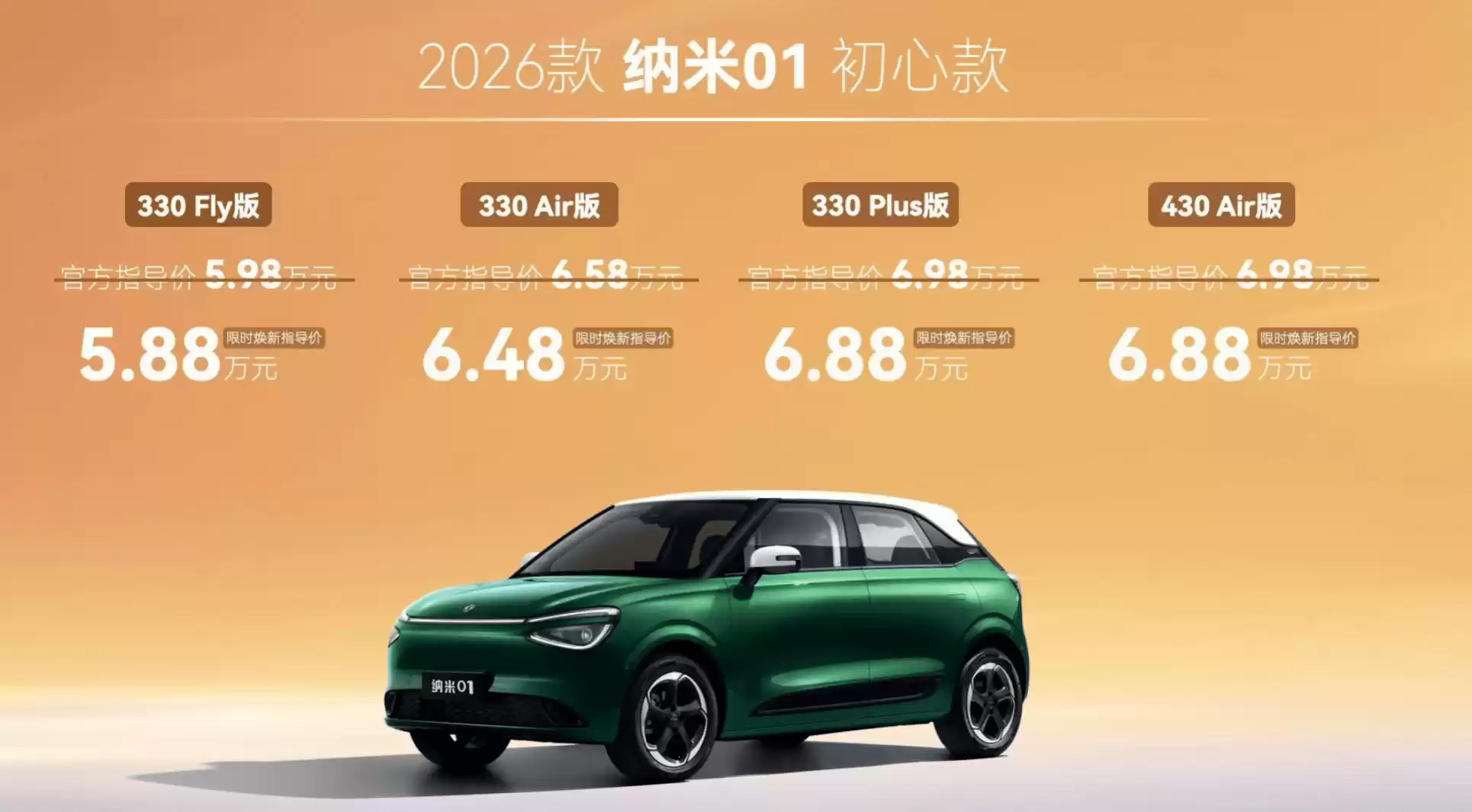 内饰配置上,2026款纳米01延续5英寸液晶仪表与12.8英寸中控屏的组合布局。初心款提供手机互联功能,挚爱款则配备智能语音助手。高配车型标配50W前排手机无线充电、皮质座椅、前排座椅加热与通风功能;挚爱款额外新增智能限速控制系统。动力系统采用前置单电机,最大功率70千瓦,峰值扭矩160N·m,提供31.45kWh与42.3kWh两种电池容量,对应续航里程分别为330km与430km,并支持外放电功能,有效提升日常用车的便利性。