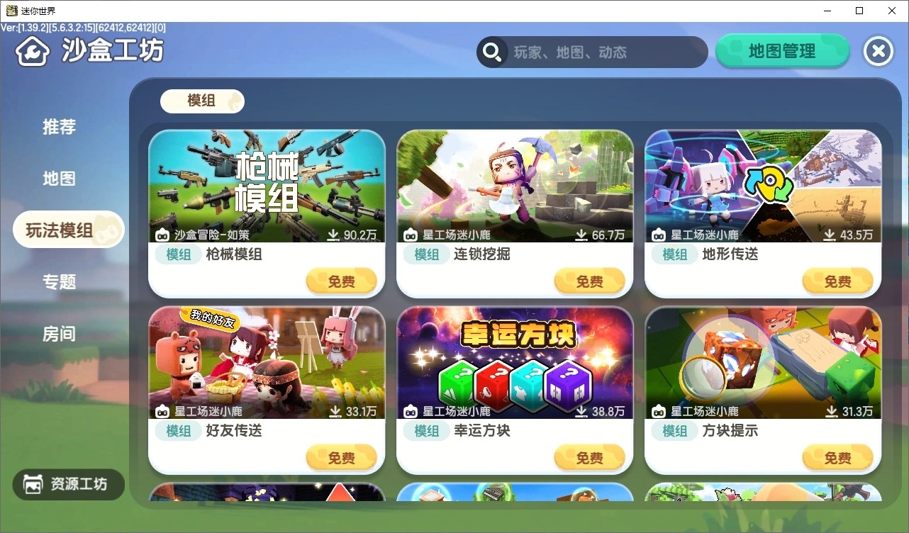 首先,在主界面中找到并点击"沙盒工坊",然后进入第三行的"资源"栏目。