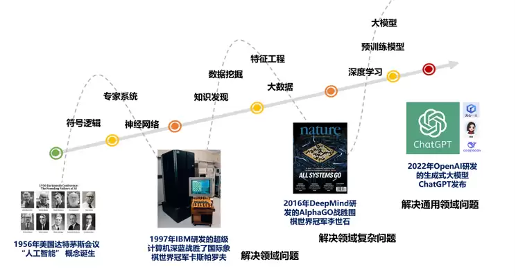 第三件事,是2024年10月30日,美国一家名叫OpenAI的公司发布了一个生成式人工智能大模型,叫ChatGPT,它真正地开启了大模型时代。之后全球出现了百模大战,中国也出现了DeepSeek、豆包、文心一言、ChatGLM等大量模型,让我们看到了通用人工智能的曙光。