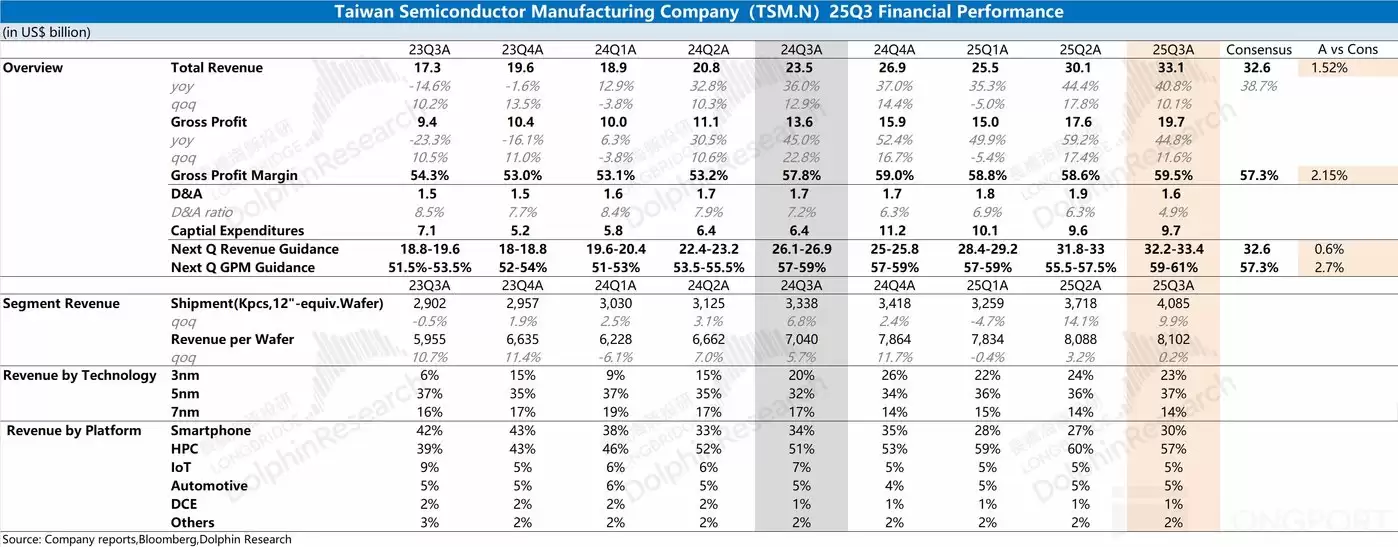 本季度台积电财报表现稳健,营收与毛利率双双超出市场预期(已上调),其中毛利率大幅回升至59.5%的高位。