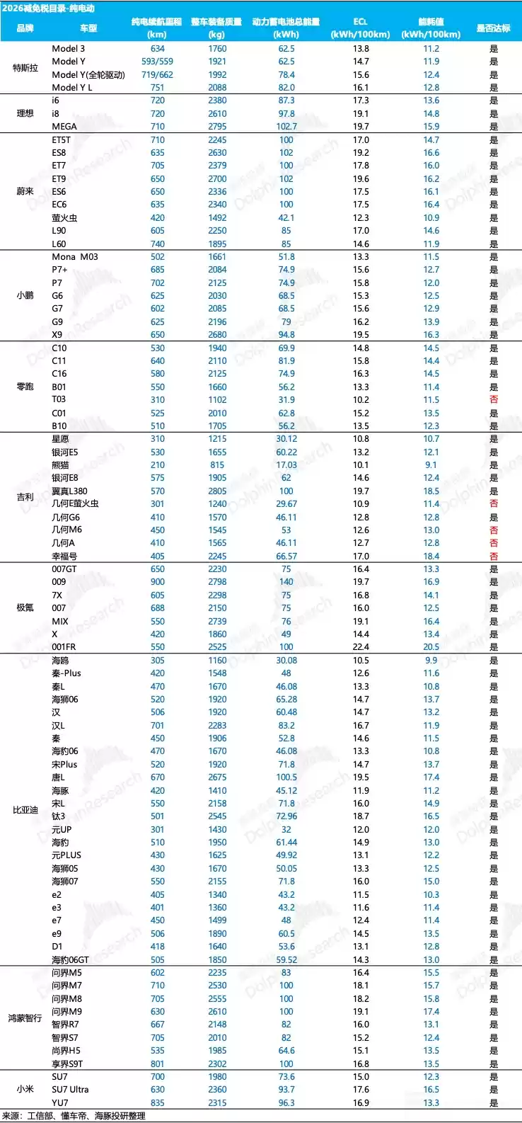 为了更直观地评估新政策对市场的影响,我们依据新规对已覆盖的多家新能源车企在产在售的纯电车型进行了测算,并整理出能够进入2026年《减免税目录》的车型名单。