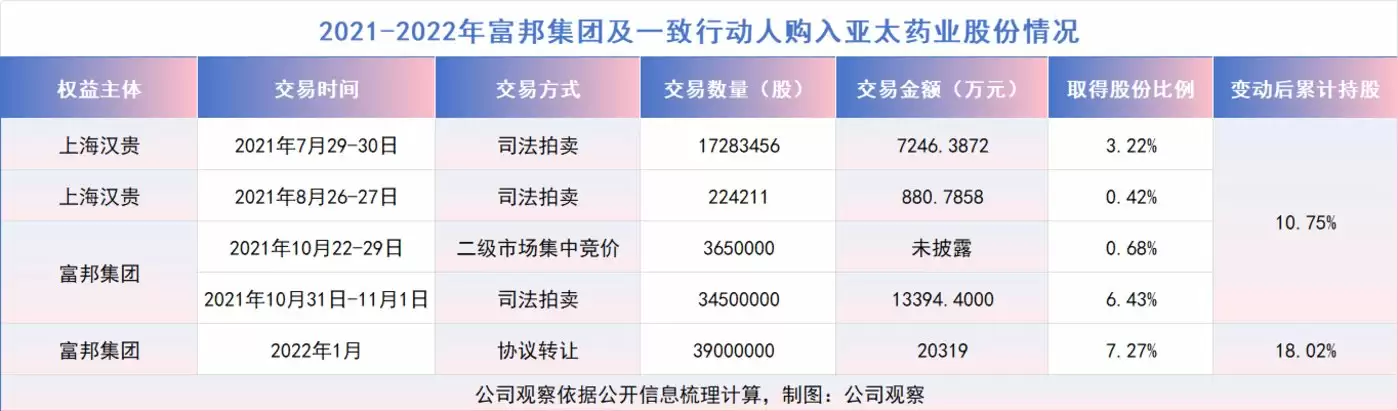 经梳理发现,富邦集团与汉贵投资当时通过司法拍卖、二级市场集中竞价的方式合计获得亚泰药业股份5565.77万股,占总股本的10.75%;其中,通过司法拍卖所得股份为5200.77万股,对应2.15亿元的拍卖总价,可得出这部分成本价为4.14元/股。