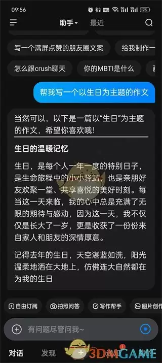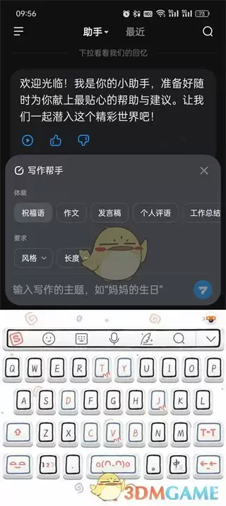 2、在写作助手页面中,选择好文章体裁,设置好写作要求之后,输入主题内容并发送;