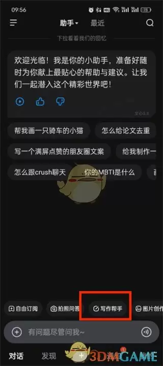 1、首先打开文心一言软件,进入首页后可以看到不同功能模块,这里我们点击【写作助手】进入;