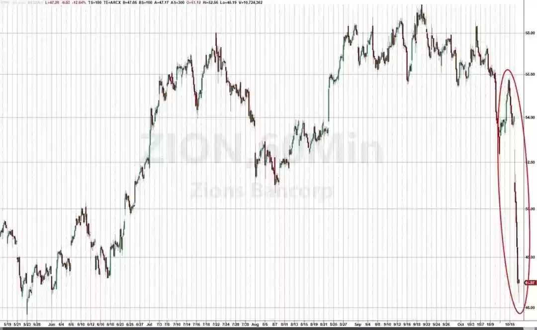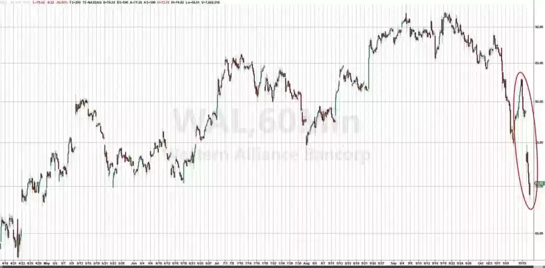 其中,美国区域性银行Zions Bancorp股价单日暴跌了13%,此前该银行披露其加利福尼亚分部的两笔贷款出现意外亏损,这加剧了投资者对隐藏的信货压力的不安。另一家同类银行Western Alliance下跌了10.8%,此前该公司称已对一名借款人提起欺诈诉讼。