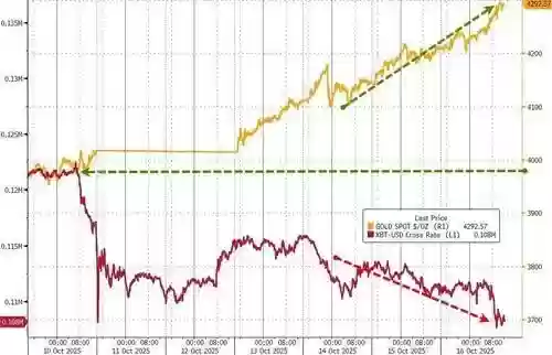 除了美债外,近来市场上最为炙手可热的避险资产黄金,隔夜无疑也开足了上涨的马力。金价周四连续第四个交易日创下新高,一度触及每盎司4380美元。今年迄今,金价已累计上涨逾60%,得益于地缘政治紧张局势、激进的降息预期、各国央行买盘、去美元化趋势以及资金大举流入黄金支持的交易所交易基金(ETF)。
