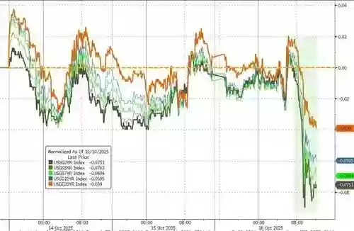 随着信贷担忧推动避险需求,美国国债价格在隔夜全线飙升,两年期国债收益率跌至2024年9月以来的最低水平,10年期美债收益率则进一步跌破4%关口,尾盘下跌6.9个基点至3.976%,刷新了4月"解放日"关税以来的新低。