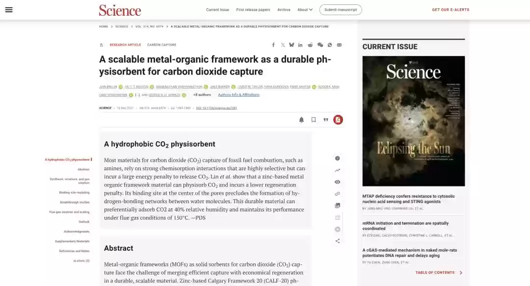 近年来,工业领域的碳捕集技术成为MOF材料的重要应用方向。例如卡尔加里大学团队开发的CALF-20系列材料,在含水含氧的复杂环境中依然能保持优异的吸附性能,突破了传统材料在潮湿环境中容易失活的限制。该材料已被加拿大公司用于捕获水泥生产过程中产生的温室气体。