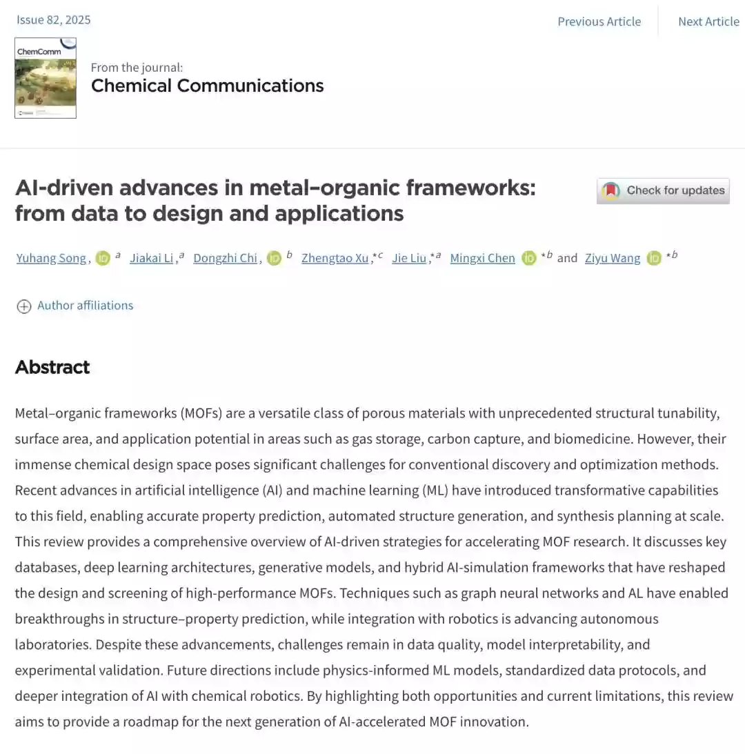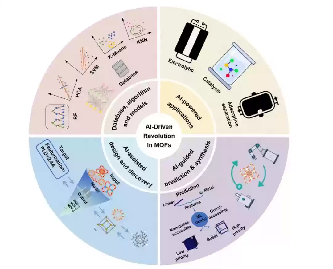 天津理工大学、中国科学院与新加坡科技研究局联合团队的研究表明,人工智能技术正从数据驱动和算法创新两个维度重塑MOF研究。