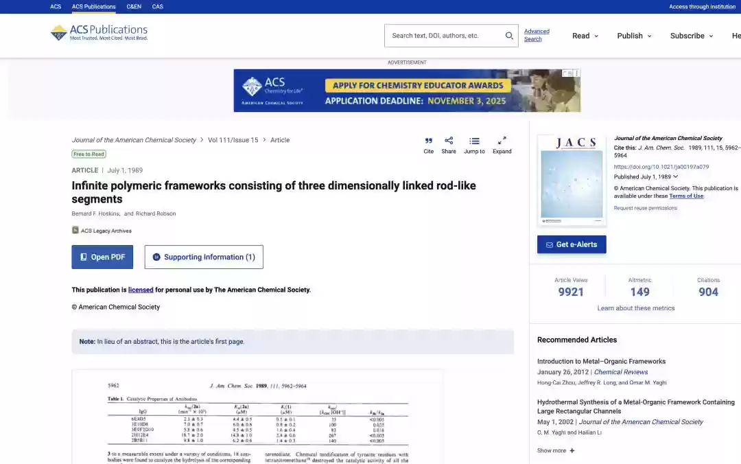 这项开创性研究以《由三维连接棒状片段构成的无限聚合物框架》为题,发表在《美国化学会志》上。合作者Ben F. Hoskins提供的实验证据,为MOF概念的萌芽奠定了重要基础。