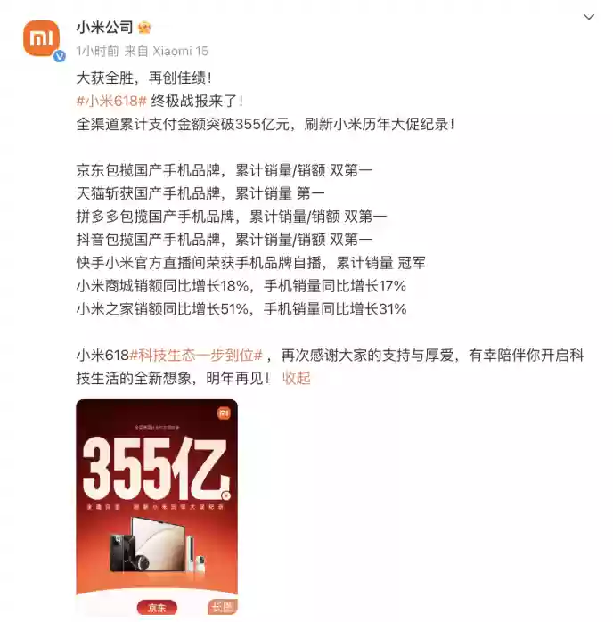 6月19日,小米正式公布了2025年618大促的收官战报。截至6月18日23时59分,小米全渠道累计支付金额突破355亿元,刷新品牌历年大促记录,再次创下新高。手机品类表现抢眼,全面霸榜京东、天猫、拼多多、抖音等电商平台的国产品牌销量榜首,其中小米15斩获京东平台4000-5999元价位段国产手机销量冠军,Redmi K80则包揽京东、拼多多、抖音、快手四大平台2000-2999元价位段国产手机销量第一,并同时登顶天猫平台国产手机热卖榜。
