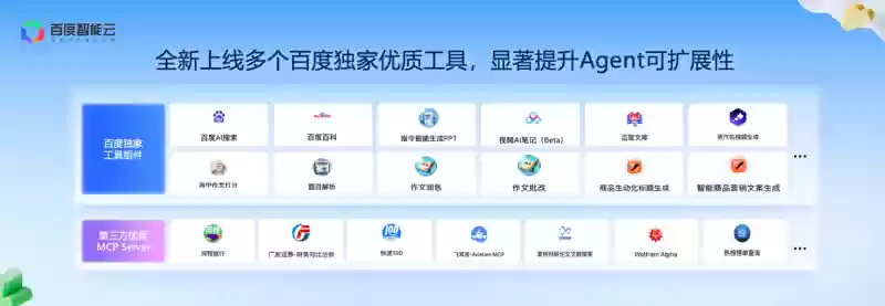 在工具与MCP服务层面,除百度AI搜索、百度百科外,平台全新上线了视频AI笔记、百度文库、蒸汽机视频生成等多个百度独家优质工具组件,并开放生态引入同程旅游、支付宝支付等第三方MCP服务,大幅提升了智能体的功能扩展性。其中,百度AI搜索组件基于百度25年搜索技术积累,通过信源权威性、内容时效性的深度优化,为智能体提供精准可控、上下文丰富且知识覆盖面更广的高质量信息检索服务。基于万亿级网页数据和全模态检索能力,百度AI搜索向智能体开放了包括百度百科、阿拉丁卡片在内的多年沉淀的优质资源,并能提供毫秒级响应的企业级高可用服务保障。