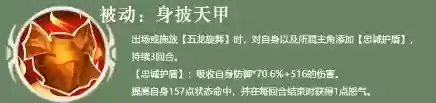 出场或施放【五龙旋舞】时,为己方和所属主角附加【忠诚护盾】,持续3回合。该护盾可吸收相当于自身防御*70.6%+516点的伤害,提升157点状态命中,并在每回合结束时回复1点怒气。
