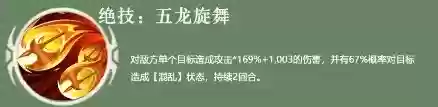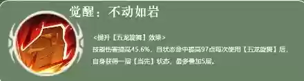 提升【五龙旋舞】效果,技能伤害增加45.6%,状态命中提升97点。每次使用【五龙旋舞】后,自身获得一层【当先】状态,最多叠加5层。