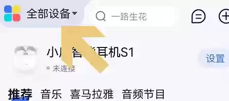 1、启动小度App后,首先点击首页左上角的"全部设备",如果您绑定了多个设备,记得先从中找到小度在家智能设备;