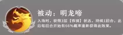 入场时立即获得3层【铁骑】状态,持续1回合,此后每回合开始时均有66%概率重新获得该效果。