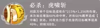 对一名敌人造成攻击力215%+1,256点伤害,并大幅提升本次攻击的命中率60%,同时有60%几率附加【中毒】状态。若目标的攻击力低于马超自身,则触发几率额外提升40%,效果持续3回合。